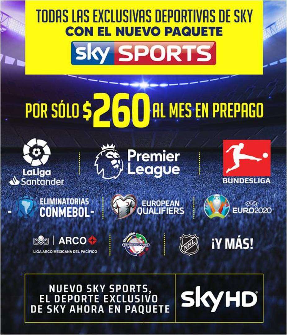 SKY SPORTS, EL NUEVO PAQUETE QUE BRINDA LA OFERTA DEPORTIVA MAS COMPLETA EN MEXICO A UN EXCELENTE PRECIO, CON EL CONTENIDO EXCLUSIVO CARACTERISTICO DEL LIDER EN TELEVISION DE PAGA. OBTEN EL PLACER DE DISFRUTAR DE TODOS LOS DEPORTES MAS VISTOS AL REDEDOR DEL MUNDO!!! POR SOLO $260 AL MES PUEDES DISFRUTAR DE UNA PROGRAMACION DE TELEVISION COMPLETA!!! INCLUYE CANALES DE *TV ABIERTA ( CANAL DE LAS ESTRELLAS, CANAL 5, SIETE) *CINEMA ( FOX, EDGE, HBO, PARAMOUNT, WARNER BROS) *CANALES DEPORTIVOS ( FTUBOL SOCCER, BASEBALL, FUTBOL AMERICANO, BASQUETBALL, TENNIS, BOX) *CANALES PARA NINOS (DISNEY, CARTOON NETWORK, NICKELODIO)