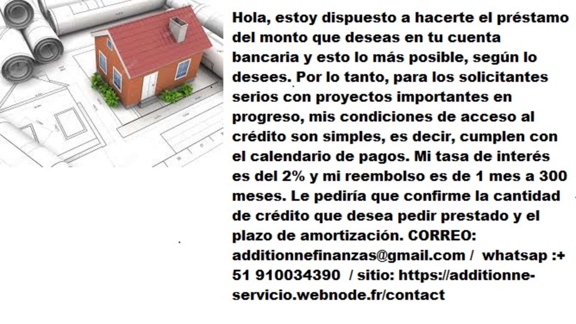 Necesita una financiacion para su casa, para sus asuntos, para la compra de coche, para la compra de moto, para la creacion de su propia empresa, por sus necesidades personales mas de duda. Concedo creditos personales que van de 5000 a 50.000.000 con un porcentaje de interes nominal del 2% cualquiera que sea el importe. Quiere precisar en sus solicitudes de prestamo el importe exacto que desearia y su duracion de reembolso. Para para tener mas ejemplo noscontactar nos sobre esta direccion correo electronico: E-mail : additionnefinanzas@gmail.com / whatsap : +51 910034390 / sitio: https://additionne-servicio.webnode.fr/contact