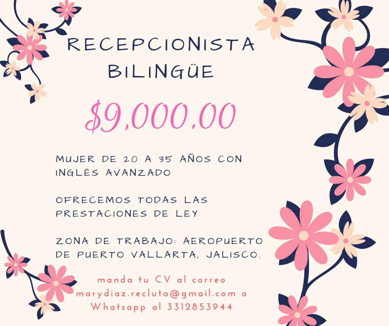 ***Si te interesa la vacante manda tu CV al correo marydiaz.recluta@gmail.com o Whatsapp al 3312853944