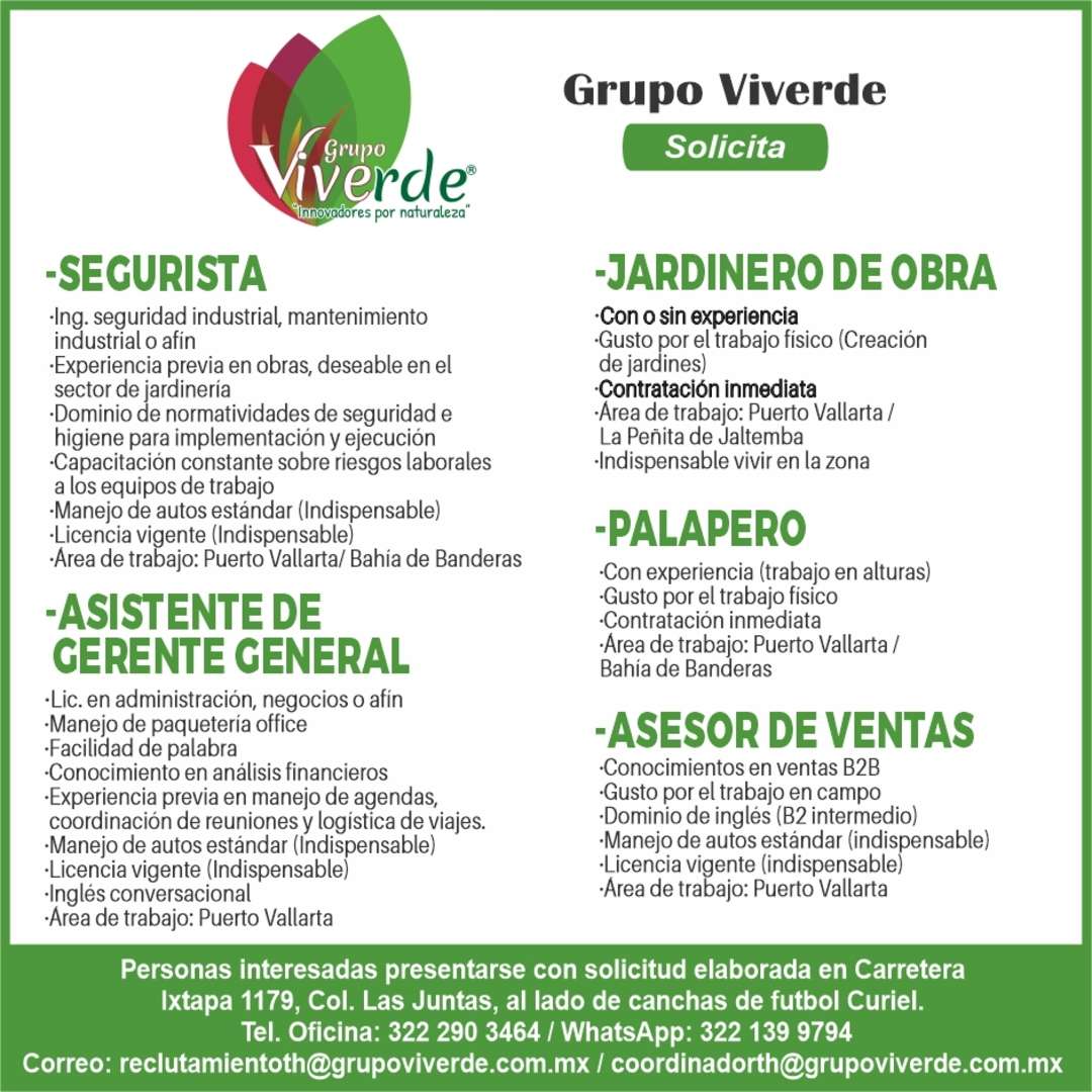 -SECURISTA -ASISTENTE DE CERENTE CENERAL -JARDINERO DE OBRA -PALAPERO -ASESOR DE VENTAS