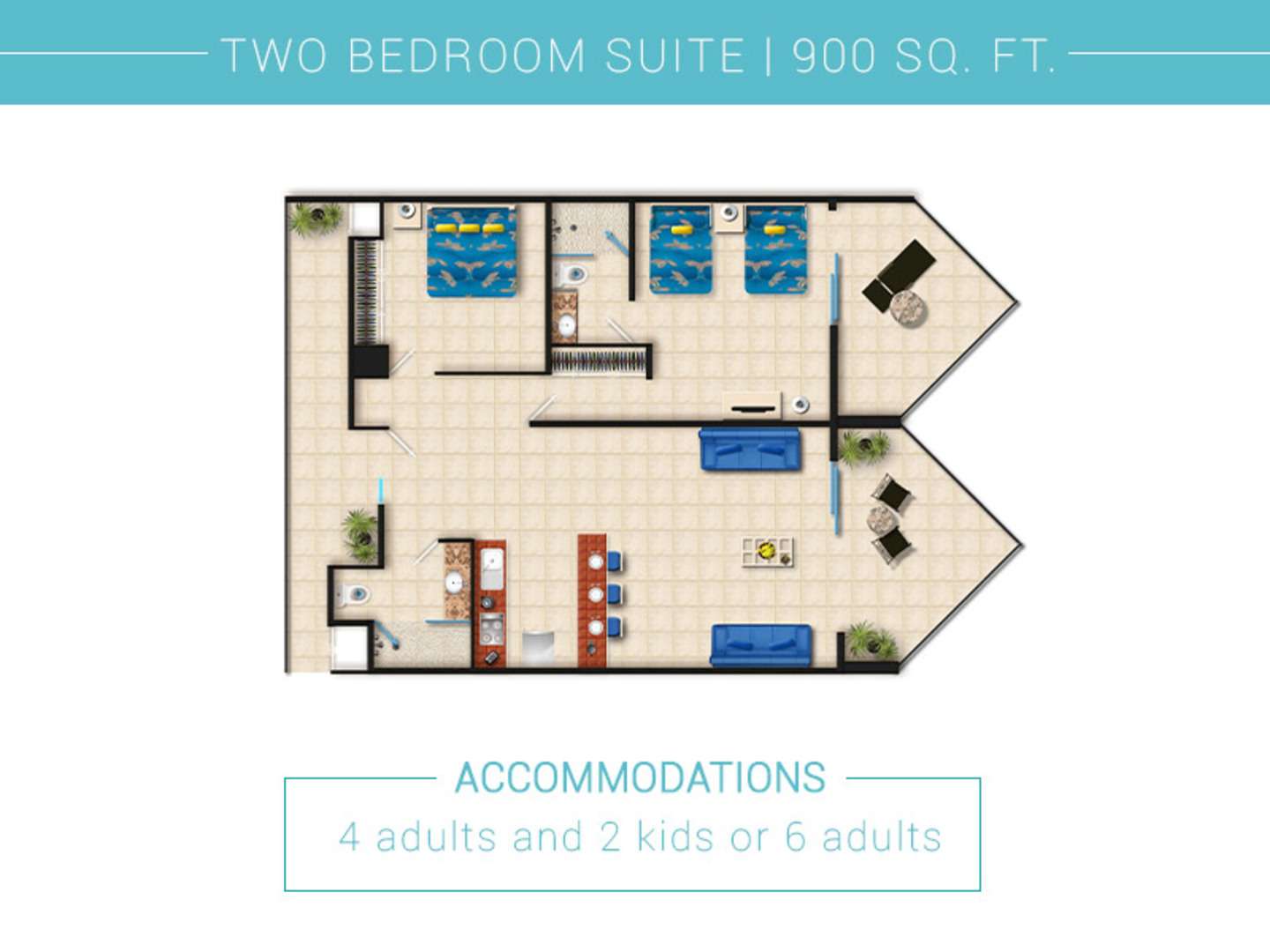 Si el espacio es un problema nuestra fabulosa Suite de Dos Recamaras es la solucion Cuenta con dos amplios dormitorios una habitacion principal con cama king y una habitacion adicional con 2 camas queen que ofrecen perfectamente la privacidad que necesita ademas de un sofa cama en la lujosa sala de estar Hay hasta tres banos completos varian segun la unidad con decoracion de marmol travertino banera y ducha La sala y una cocina completamente equipada proporcionan el escenario perfecto para relajarse y el balcon exterior amueblado para hasta 6 personas permite disfrutar del ambiente sereno de la vista al mar o al jardin Ocupacion maxima 4 adultos y 2 menores o 6 adultos