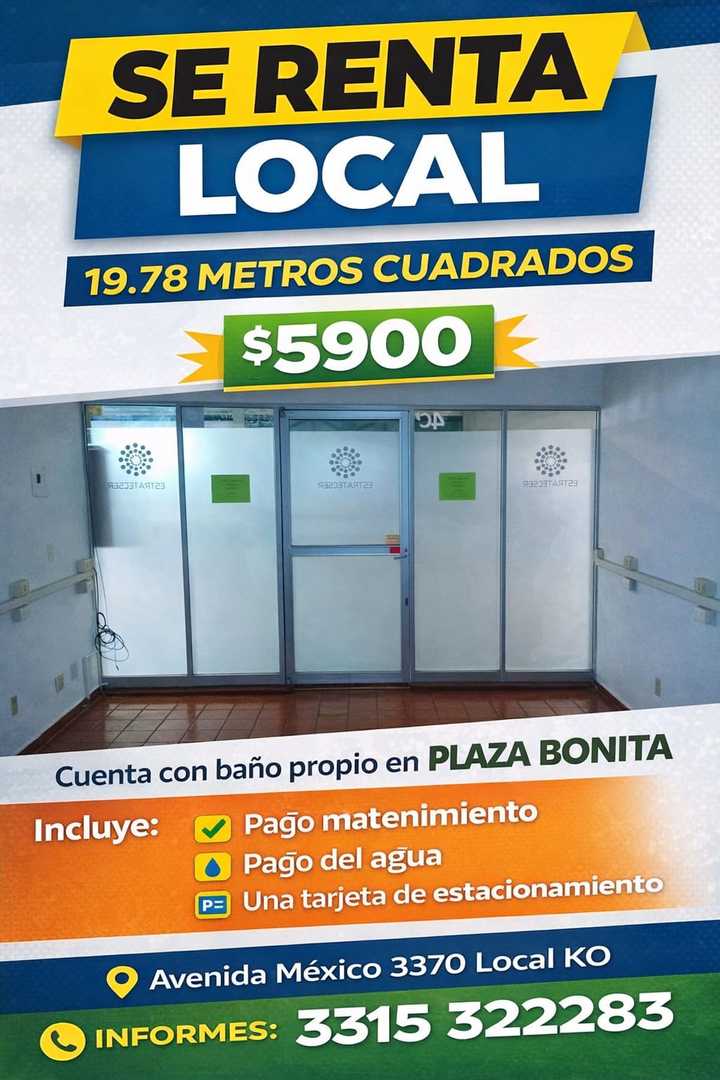 Oportunidad. Local en renta en Plaza Bonita. Precio: $5,900. Superficie de 19.78 m², ideal para tu negocio. Características: baño propio, mantenimiento incluido y tarjeta de estacionamiento. Ubicación: Av. México 3370, Local K0. Requisitos: mes de renta más mes de depósito. Agenda tu cita al WhatsApp 33 15 32 32 83.
