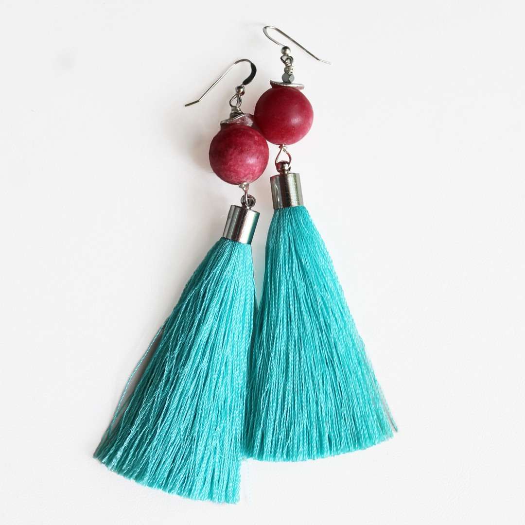 Home > Varios > Servicios Profesionales > Arte y Decoración > aretes de verano con fleco turquesa y rodonita