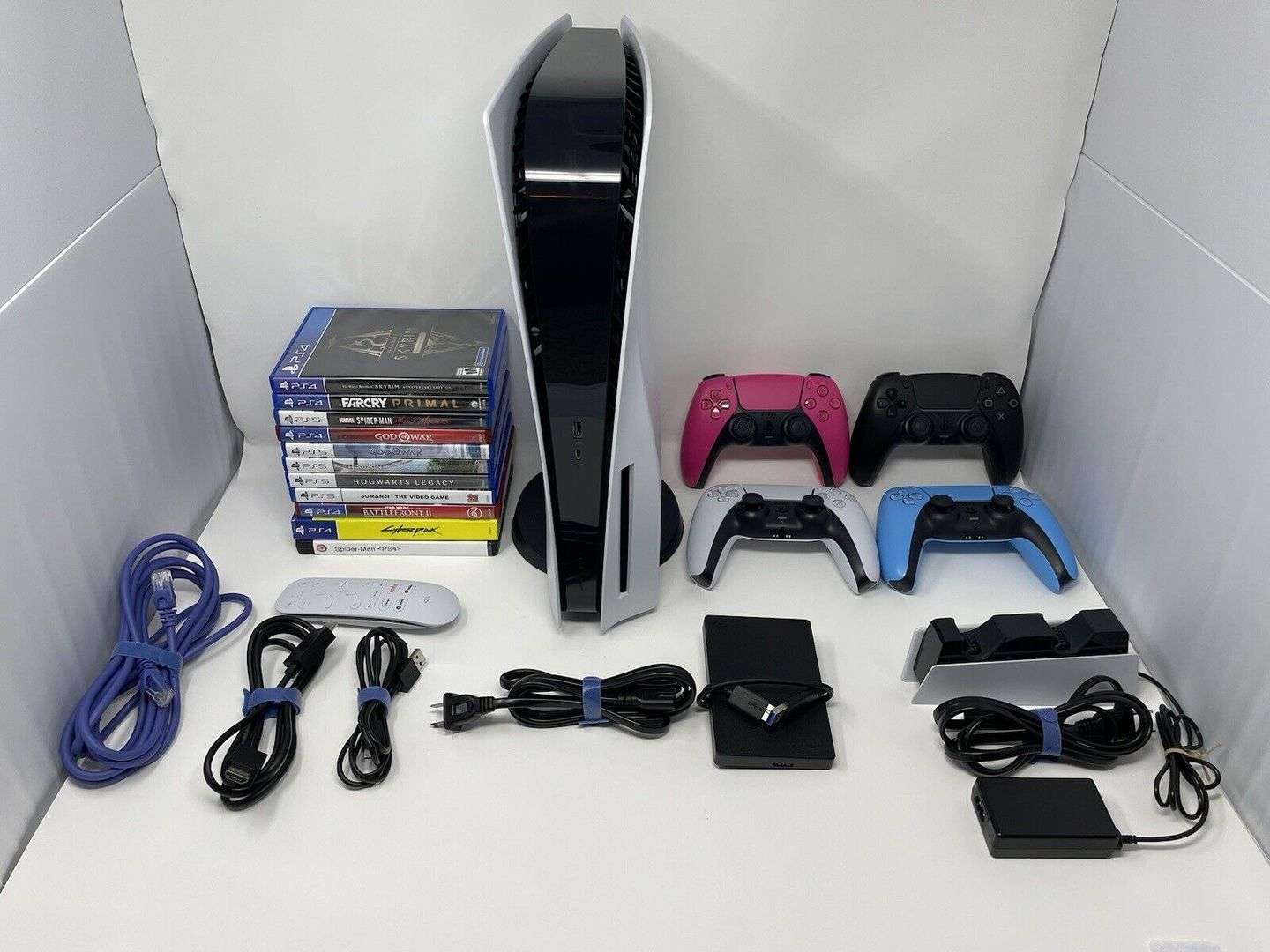 Controlador DualSense, un soporte para su PS5, un cable HDMI, un cable de alimentación y un cable USB C a USB.