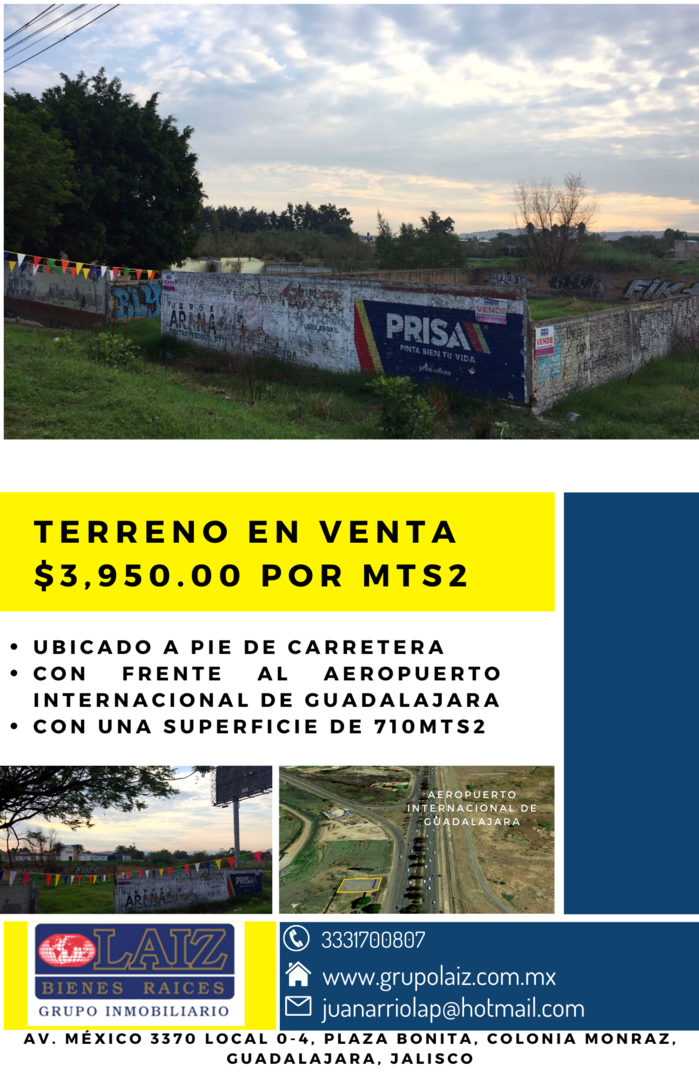 Terrenos cerca de carretera Guadalajara - Chapala a la altura del Aeropuerto Internacional de Guadalajara, Jalisco. Gran oportunidad de compra para grandes proyectos a futuro con excelente plusvalía. Con uso de suelo mixto. Inf. 33 33 94 98 66